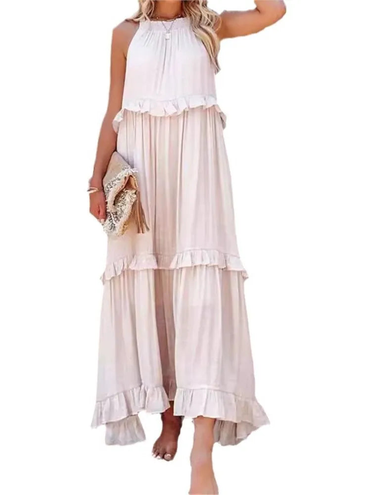New Arrival elegant summer dress for women, perfect for vacations and beach days. Designed with a chic halter neck and a stylish backless lace-up detail that adds a feminine, modern touch. Features a loose, flowy A-line silhouette with ruffled (flounced) edges for effortless elegance. Made from a lightweight polyester & acetate blend with slight stretch, ensuring comfort in warm summer weather.