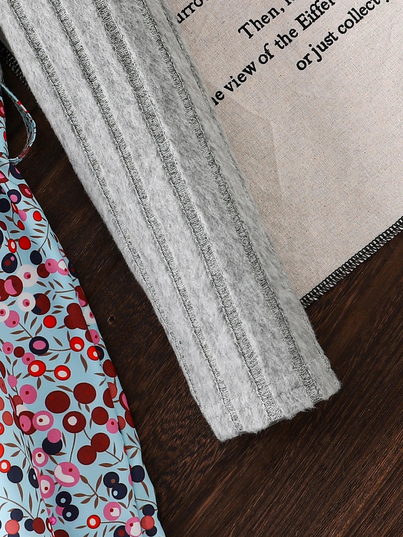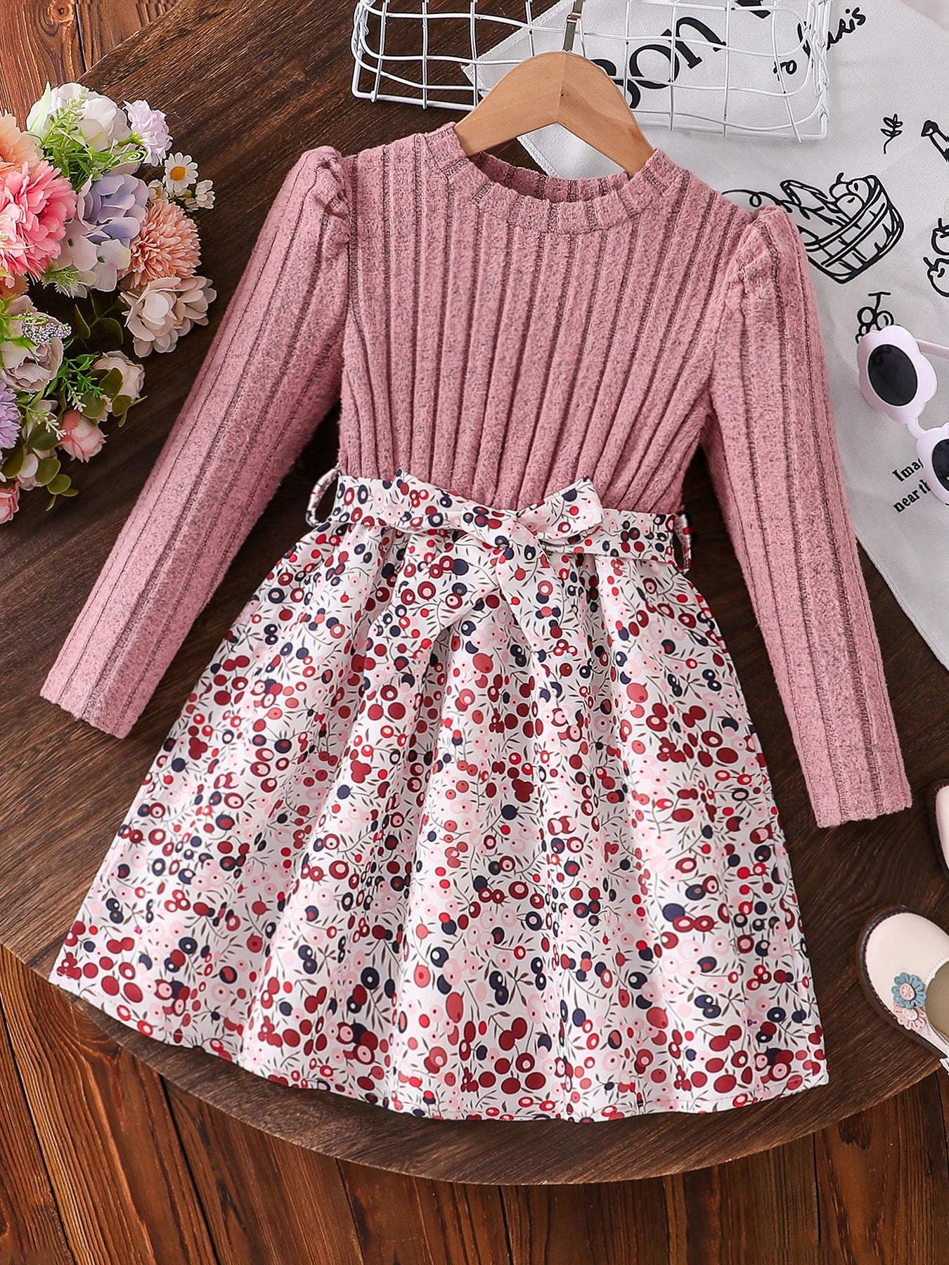 Spring and Autumn Girls' Simple Casual Versatile Knitted Round Neck Long-Sleeved Floral Dress Girls' Daily Casual Dress
