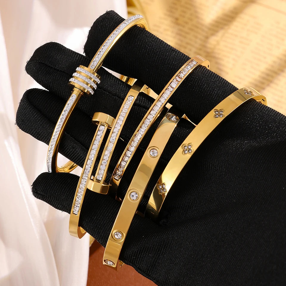 Titanium Steel Stacked Bracelet Couple's Shiny Zircon Inlaid Stainless Steel Bangles Gold Color Female Jewelry Gift